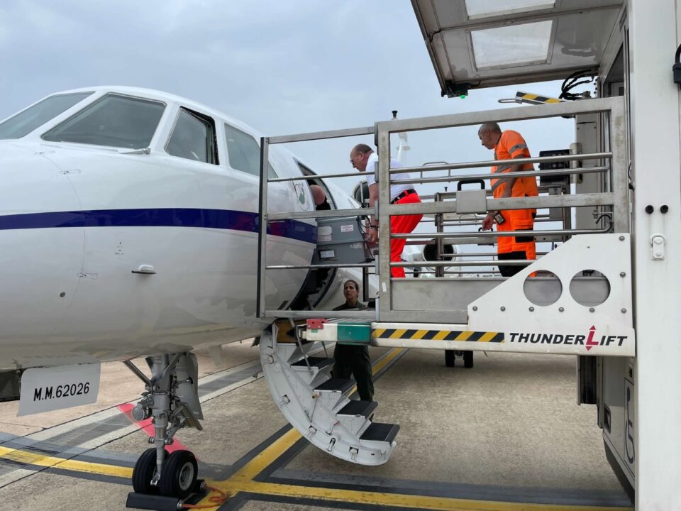 È da qui che il Falcon 50 è decollato poco dopo le ore 13.00 alla volta dell’aeroporto di Cagliari, dove è atterrato intorno alle ore 14:00 e ha potuto così imbarcare i due piccoli pazienti, di cui uno in culla termica, accompagnati dai genitori e da un’equipe medica.
