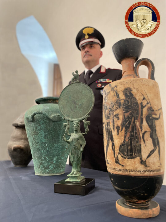 Inoltre, sono stati esposti anche importantissimi reperti archeologici etruschi, recuperati nell’ambito della stessa attività investigativa, che saranno restituiti ai musei che la Direzione Generale del Ministero della cultura individuerà in relazione alla loro origine, consistenti in: