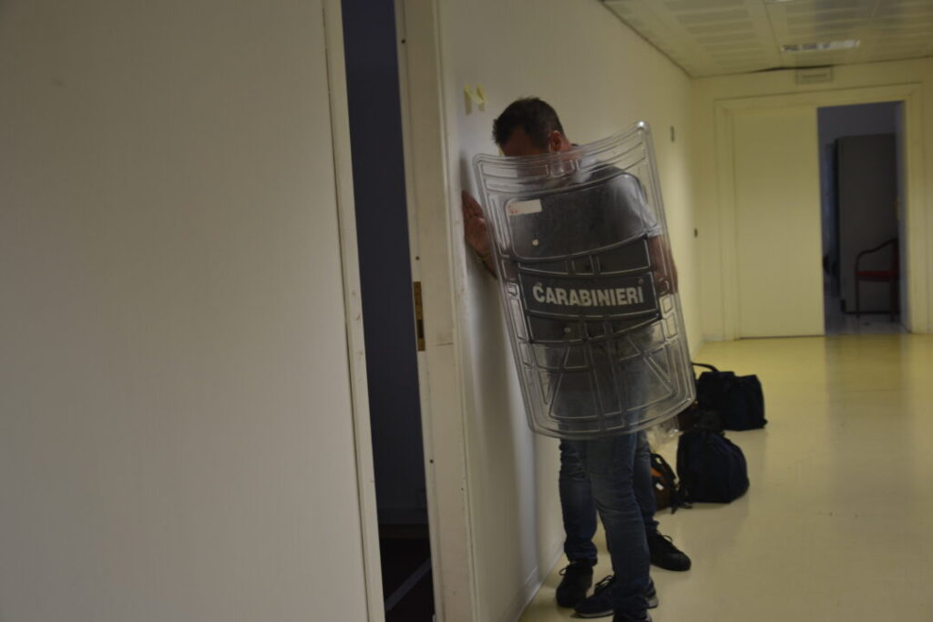 Con indosso un Gap, un elmetto, uno scudo (addestrativo) in plexiglass, una radio, uno zaino che deve contenere materiale da lavoro ma anche personale, una cartellina, gli allievi sono stati chiamati, a rotazione, a svolgere tre differenti esercizi in un tempo pre stabilito.