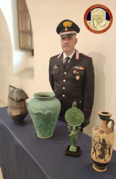 – “Operazione Canusium”: il Nucleo TPC di Bari esegue un’ordinanza di applicazione di misura cautelare, emessa dal GIP del Tribunale di Trani su richiesta dalla Procura della Repubblica presso il Tribunale di Trani, nei confronti di 21 soggetti tutti ritenuti responsabili di associazione a delinquere finalizzata allo scavo clandestino, furto, ricettazione ed esportazione illecita di reperti archeologici e numismatici. Veniva così colpita un’associazione a delinquere operante del Centro e Sud Italia con il risultato di 51 soggetti indagati e 50 perquisizioni. L’attività investigativa era stata avviata nel 2022 a seguito dell’individuazione nell’agro di Canosa, mediante la componente aerea dell’Arma pugliese, di diversi scavi clandestini.