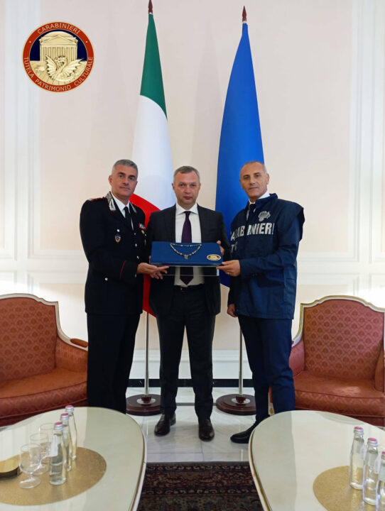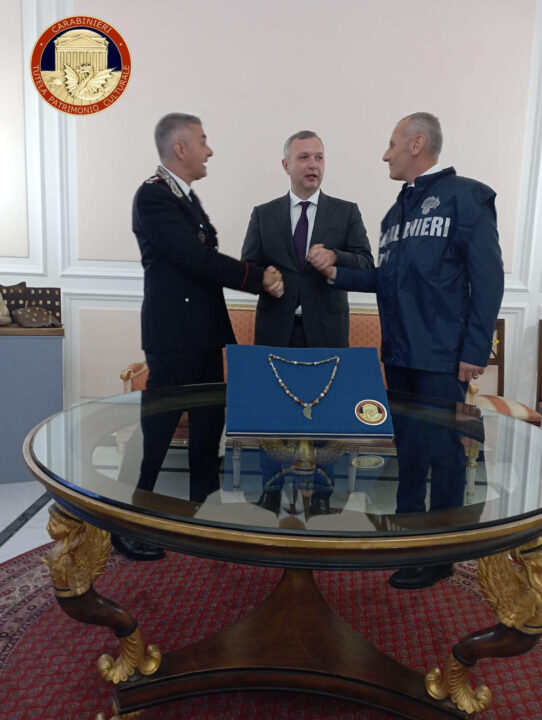 ROMA. Ieri, a Roma, presso l’Ambasciata d’Ucraina in Italia, alla presenza dell’Ambasciatore di Ucraina in Italia, Dott. Yaroslav Melnyk e del Ministro Consigliere presso l’Ambasciata, D.ssa Oksana Amdzhadin, i militari del Nucleo Carabinieri Tutela Patrimonio Culturale di Roma hanno restituito a quella Nazione un’antica collana, composta da pietre semipreziose in vetro, pasta di cristallo e ambra, risalente al I sec. a.C. – III sec. d.C., depredate dai siti archeologici ucraini e, in particolare, nelle necropoli ubicate in quel territorio, come il cimitero della tarda scita Chervonyi Mayak.