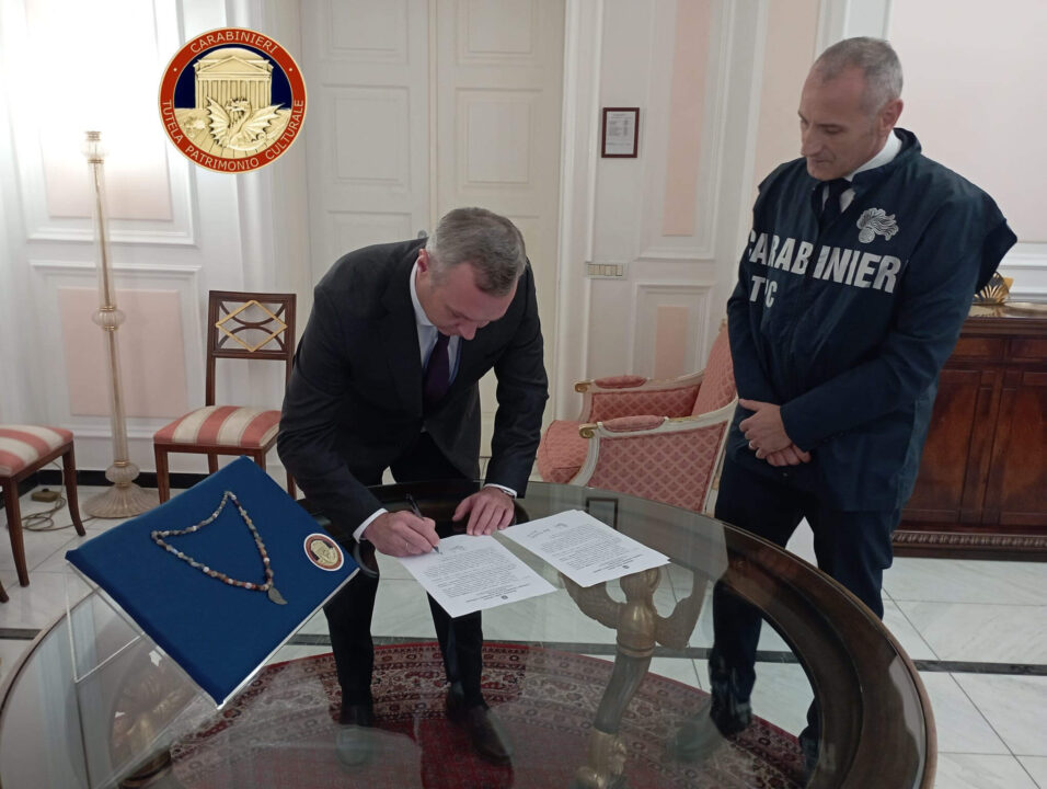 ROMA. Ieri, a Roma, presso l’Ambasciata d’Ucraina in Italia, alla presenza dell’Ambasciatore di Ucraina in Italia, Dott. Yaroslav Melnyk e del Ministro Consigliere presso l’Ambasciata, D.ssa Oksana Amdzhadin, i militari del Nucleo Carabinieri Tutela Patrimonio Culturale di Roma hanno restituito a quella Nazione un’antica collana, composta da pietre semipreziose in vetro, pasta di cristallo e ambra, risalente al I sec. a.C. – III sec. d.C., depredate dai siti archeologici ucraini e, in particolare, nelle necropoli ubicate in quel territorio, come il cimitero della tarda scita Chervonyi Mayak.