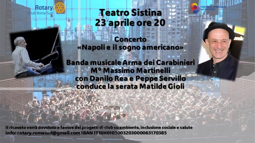 ROMA. Il prossimo 23 aprile, alle ore 20.00 la banda dell’Arma dei Carabinieri, con Danilo Rea e Peppe Servillo si esibirà al Teatro Sistina di Roma in un concerto intitolato “Napoli e il sogno americano”.