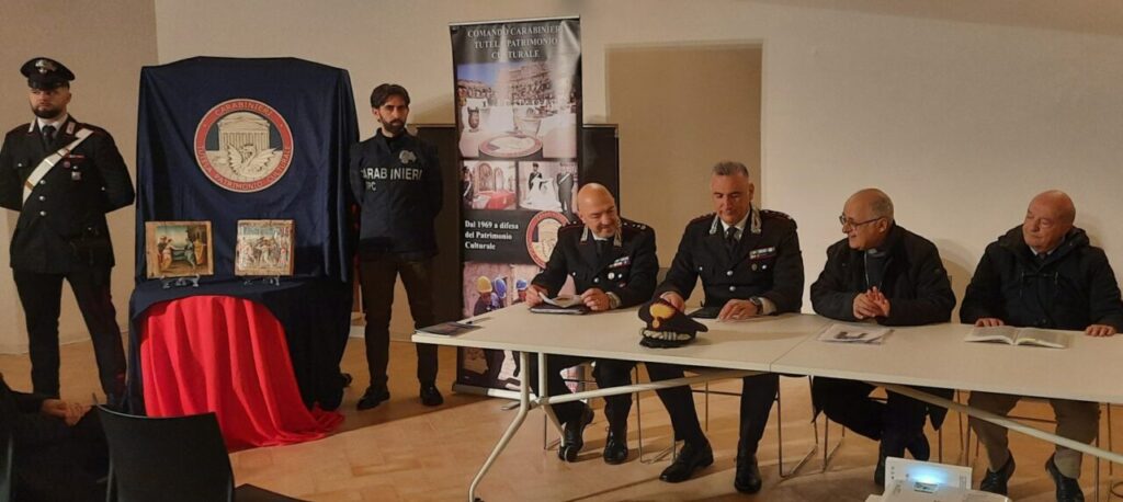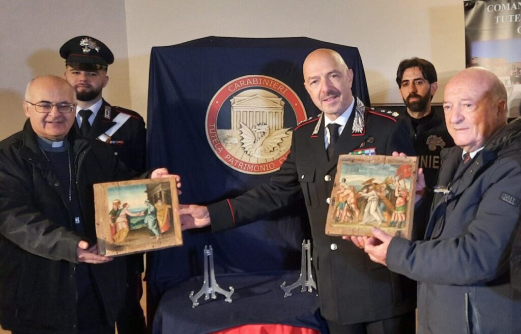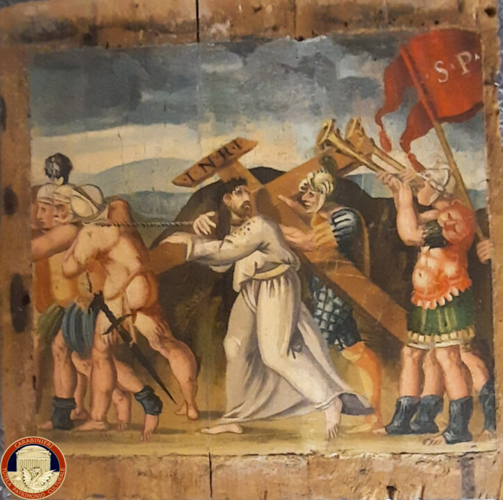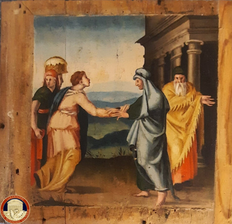 SAN SEVERINO MARCHE (MACERATA) Oggi, nel Museo MARec (Museo dell’Arte recuperata) di San Severino Marche (Macerata), sono stati riconsegnati dal Comandante del Nucleo Carabinieri per la Tutela del Patrimonio Culturale (TPC) di Bologna, Tenente Colonnello Giuseppe De Gori, a Monsignor Francesco Massara, Arcivescovo di Camerino e San Severino Marche due dipinti olio su tela applicata su tavola raffiguranti due Misteri del Rosario, la Visitazione della Madonna a Sant’Elisabetta e la Salita di Cristo al Calvario.