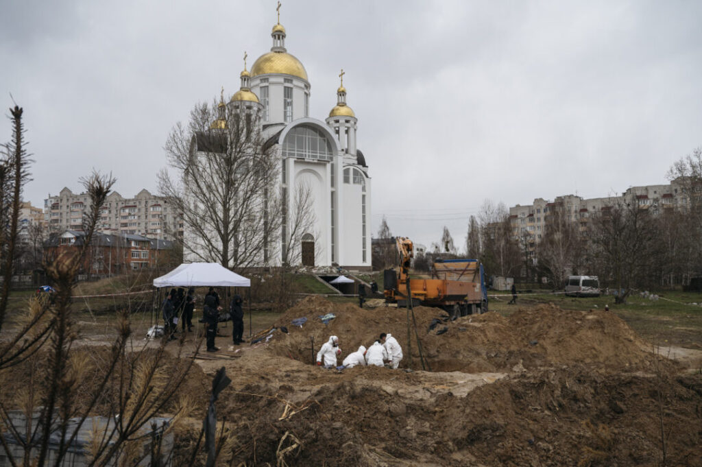 Bucha (Ucraina) – nostro servizio particolare. Nel cortile della Chiesa di S. Andrea, sotto un cielo plumbeo, una squadra d’investigatori locale continua a procedere nell’identificazione dei cadaveri trovati dopo il 31 marzo scorso, a seguito del ritiro delle Forze Armate russe dalla regione a Nord di Kyiv.