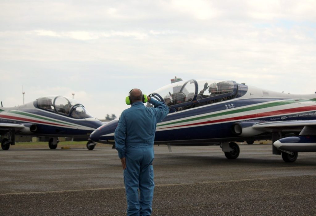 Il sottufficiale più anziano delle Frecce Tricolori saluta gli equipaggi al decollo per l’Air show all’aeroporto militare di San Damiano (Piacenza)