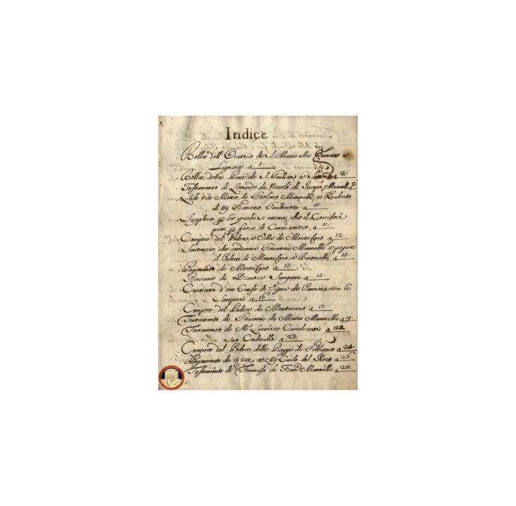fine del XVIII sec., contiene copie di documenti dal XV al XVII sec., presenti in originale in altre varie unità archivistiche del fondo suddetto, ed è costituito da carte in pergamena vergate da un’unica mano, con piccoli decori a penna bruna ed elementi fitomorfi per le lettere iniziali. La