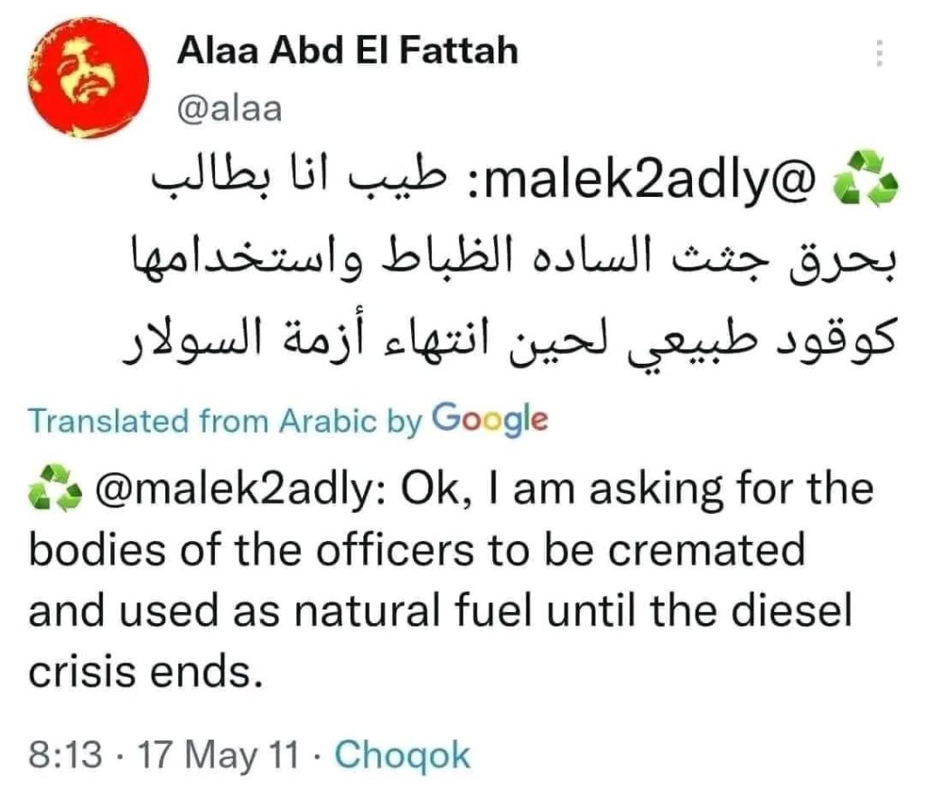 In uno di questi messaggi Abdel Fattah scriveva: “È possibile che qualcuno assassini Diaa Rashwan? Oppure, se deve essere pacifico, pacifico, dovremmo tagliargli la gola. L’importante è che smetta di parlare. Non è possibile. Questa è la cappa dell’esercito e la richiesta di legge marziale.”
