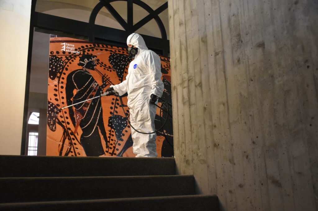 La tipologia d’intervento messa in atto e la scelta mirata di alcune sale, è stata coordinata e concordata con i responsabili ed i restauratori del museo e della biblioteca, prevedendo l’utilizzo di presidi medici adatti all’uso negli spazi indicati al fine di igienizzare e abbattere la carica microbica ambientale.