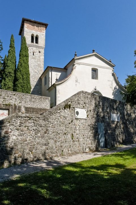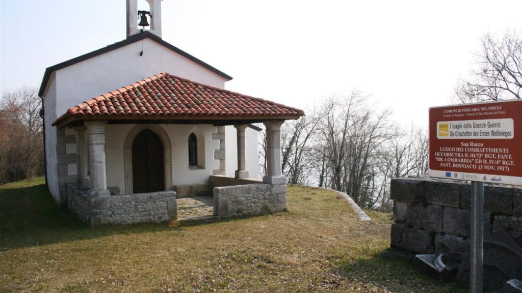 La chiesetta di San Rocco, trasformata in comando italiano durante il conflitto, fu completamente distrutta nel novembre 1917 durante l’avanzata austro-germanica.
