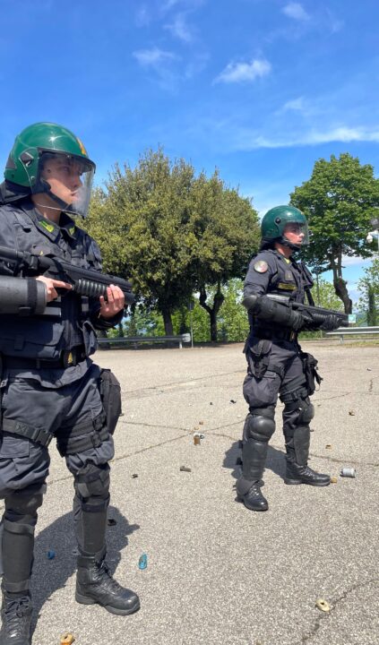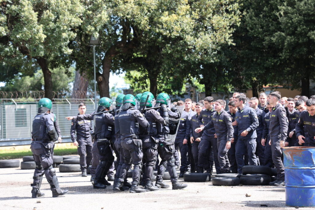 Assistiamo a un’attività esercitativa. Da una parte allievi Finanzieri a simulare un grande numero di “facinorosi” dall’altra invece altri Finanzieri che invece formano 3 squadre (ognuna composta da 10 persone; a terra operano 9 militari e 1 è l’autista del mezzo che resta sempre vicino a mezzo) in assetto antisommossa.