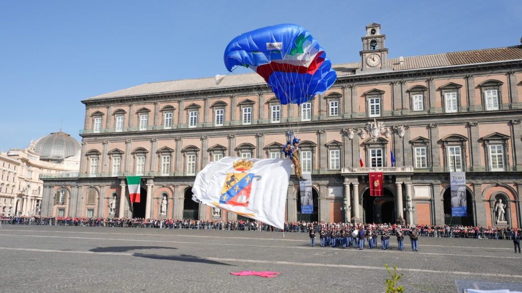 Al termine della cerimonia, i Paracadutisti dell’Esercito Italiano sono atterrati in Piazza del Plebiscito, tra la gioia ed emozione di tutti i presenti, sventolando il Tricolore nel cielo di Napoli.