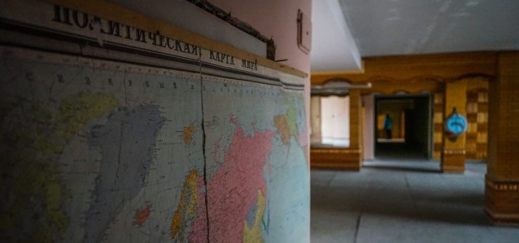 PYRAMIDEN (NORVEGIA). A Pyramiden lo spazio liminale (liminal space) è in tutto ciò che l’occhio del visitatore può vedere: nei libri ancora aperti sui banchi, nelle mappe e nei disegni appesi alle pareti della scuola.
