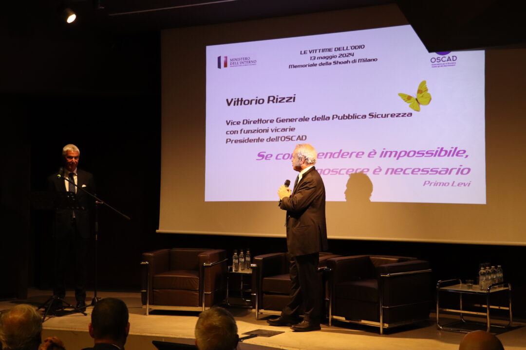 Dopo i saluti di benvenuto del presidente del Memoriale della Shoah Roberto Jarach, del coordinatore nazionale per la lotta all’antisemitismo Pasquale Angelosanto e del Prefetto di Milano Claudio Sgaraglia, è intervenuto il Prefetto Vittorio Rizzi, vice Ddrettore Generale della Pubblica Sicurezza con funzioni vicarie, nonché presidente dell’OSCAD il quale ha definito l’antisemitismo come “un odio non solo religioso, ma anche etnico, razziale e nazionale, che ha percorso la storia dell’umanità, un odio che muta e si trasforma nel corso dei secoli”.