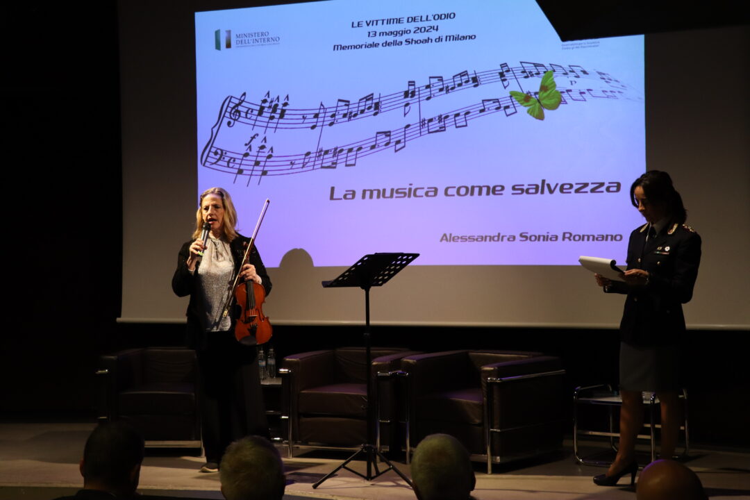 A conclusione della prima parte dell’evento, la violinista Alessandra Sonia Romano, custode del “violino della Shoah”, ha dato voce ai ricordi attraverso le note del brano KADDÍSH di Maurice Ravèl.