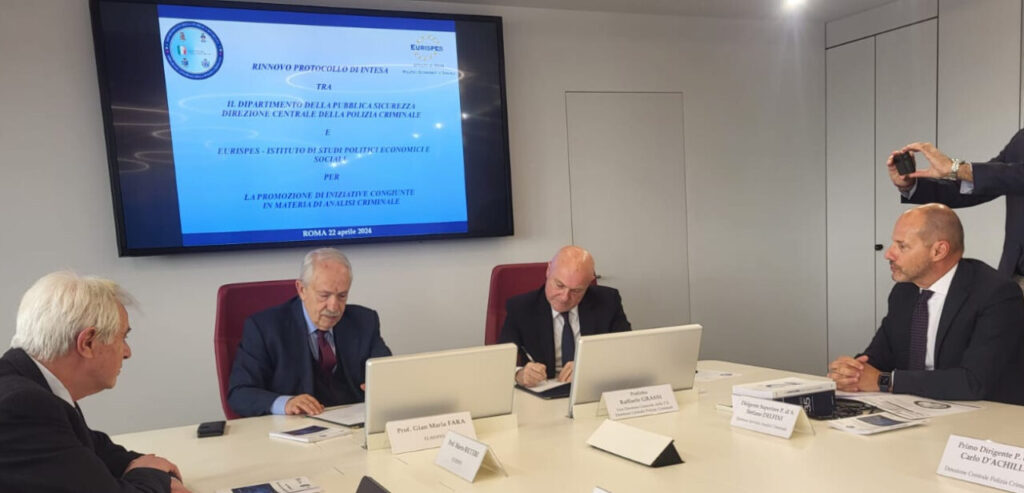 In considerazione degli esiti positivi ottenuti dal progetto, in data odierna, il Vice Direttore Generale della Pubblica Sicurezza Direttore Centrale della Polizia Criminale Prefetto Raffaele Grassi ed il Presidente Eurispes Gian Maria Fara hanno sottoscritto il nuovo protocollo, anch’esso di durata triennale, con l’intento di rafforzare la già proficua collaborazione tra i due Enti.