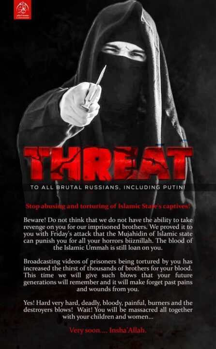Il 25 marzo, il media non ufficiale dello Stato islamico Al-Azaim ha diffuso un poster in cui minacciava il Presidente Vladimir Putin e i cittadini russi di nuovi attacchi sul suolo del Paese.