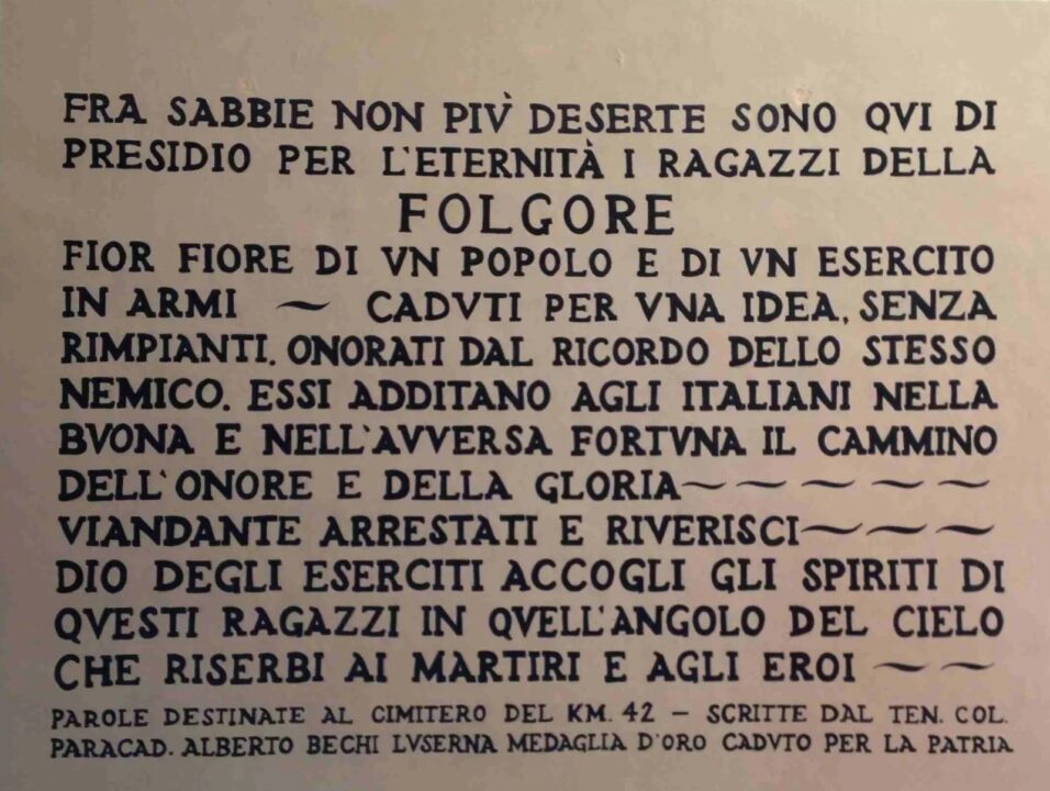 Nel corso della 2^ battaglia di El Alamein (23 ottobre – 5 novembre 1942), l’intera Divisione “Folgore”, agli ordini del Generale Frattini, perse circa 40 ufficiali ed oltre 600 uomini tra sottufficiali, graduati e paracadutisti, caduti o feriti. Davvero pochissimi i superstiti.