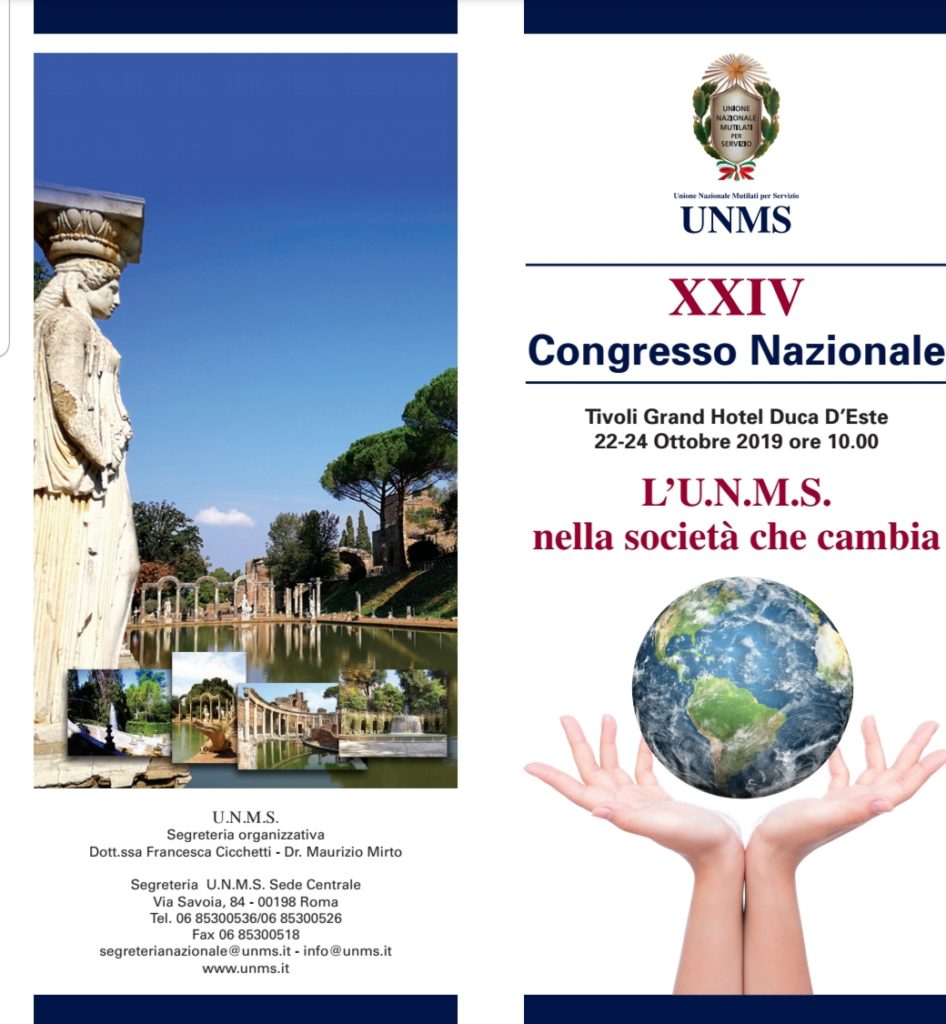 Tivoli. Tutto è pronto per il XXIV Congresso Nazionale dell’Unione Nazionale Mutilati per Servizio (UNMS): sotto il patrocinio del Senato della Repubblica, della Camera dei Deputati, della Regione Lazio e del Comune di Tivoli, il congresso che si terrà a Tivoli al Grand Hotel Duca d’Este vedrà il rinnovo del Presidente e delle cariche sociali, dal 22 al 24 Ottobre. Interverranno autorità civili e militari, i presidenti delle sedi regionali e provinciali presenti su tutto il territorio per evidenziare quanto fatto e gli obiettivi da raggiungere nel prossimo futuro.