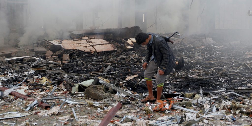 Gli effetti di un bombardamento di aerei della coalizione araba in Yemen